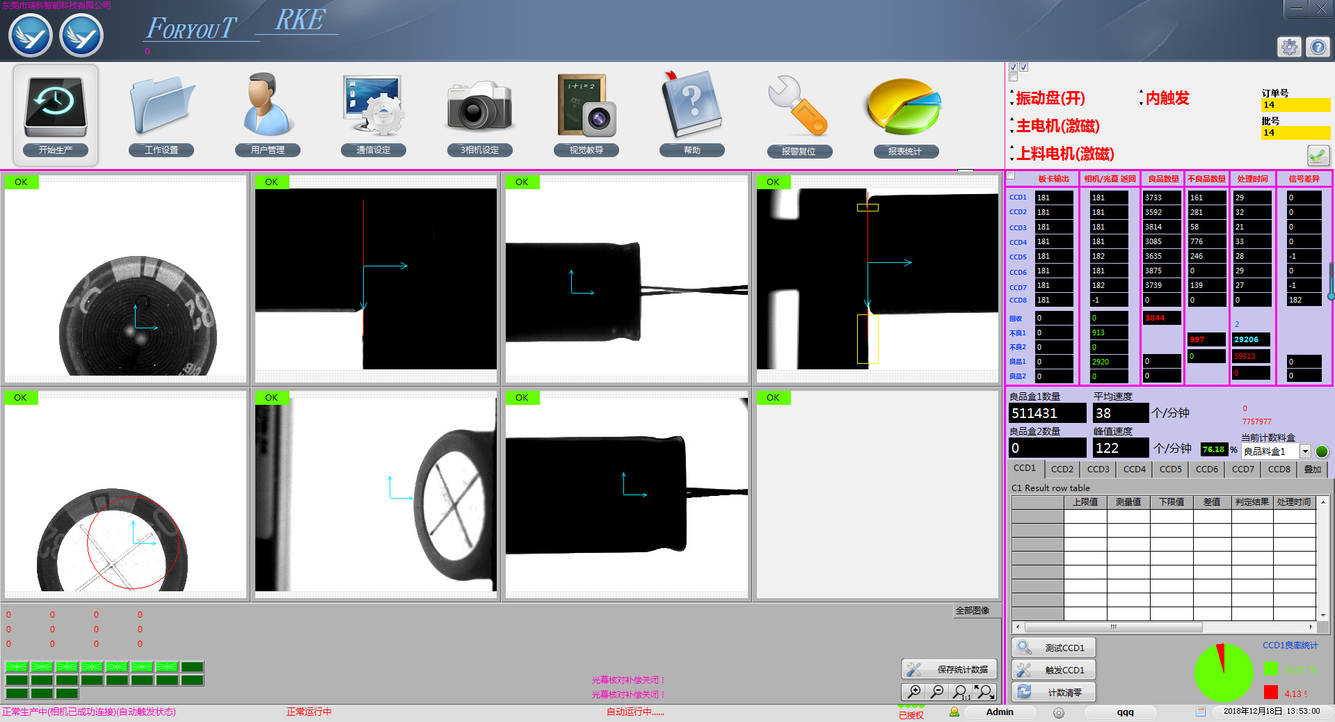 待檢產品到達流水線工位,采圖系統(tǒng)拍圖,采集完圖片,軟件自動判斷,并在軟件界面、聲光指示燈等輸出單元給出檢測結果,后續(xù)的自動化系統(tǒng)據檢測結果剔除不良品。系統(tǒng)具有數據統(tǒng)計功能,可自動保存不良品的圖片,可保存以前的設置和自動調用,可更改、添加、修改產品型號,更換新產品時只需要更改設置即可。本方法不受外界環(huán)境的影響,不受操作員自身的影響,統(tǒng)一性好,穩(wěn)定度高,可靠性強,對提高企業(yè)的生產效率和產品品質有非常大的幫助。